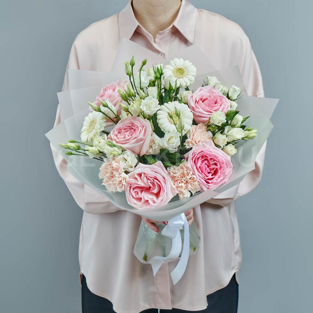 Букет розовых роз с гвоздиками4 650 ₽Букет розовых роз с гвоздиками 4 650 ₽ -