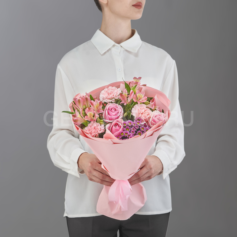 Букет из розовых гвоздик, роз и альстромерий