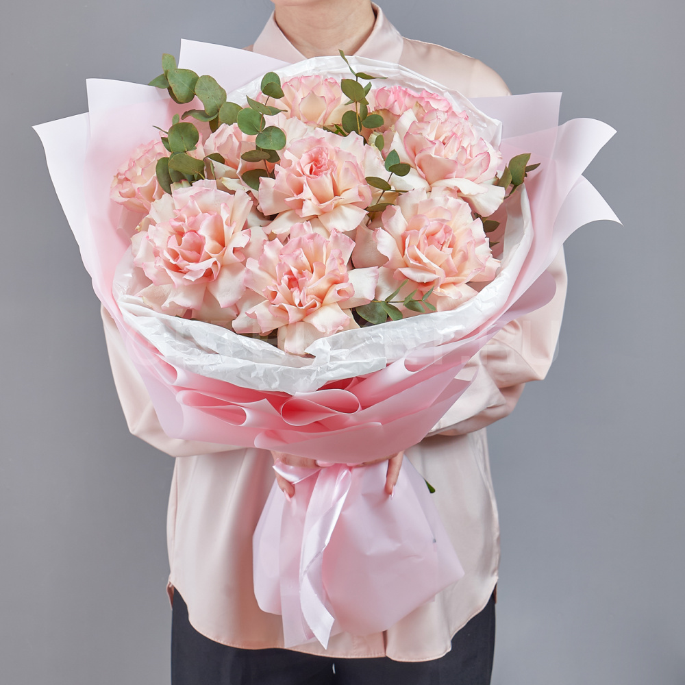 Букет нежных роз с эвкалиптом